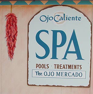 And then on to the tiny crossroads of Ojo Caliente. We had long planned on coming to this rustic hot mineral springs spa for some therapeutic R&R which was obviously indicated after our stressful wanderings! I had decided to try out a small inn, The Inn & Mercantile at Ojo along the road to the spa since it seemed to be more charming and in better repair. Situated on the right hand side of Hot Springs Road, catty-corner to the church, the Mercantile part of the equation, a small boutique selling everything from antiques and knickknacks to clothing, jewelry and sculpture, served as our check-in. We were directed to our room, one of several occupying a wing tucked behind a coyote fence that separated the courtyard and parking area from the road. The room, described later by our hostess as New Mexico Territorial style, was simple and clean, furnished with a king bed, an attractive antique wardrobe, a reading chair and a private bathroom. We dumped our bags, grabbed our swimming suits, set up our breakfast time and headed off to the spa.