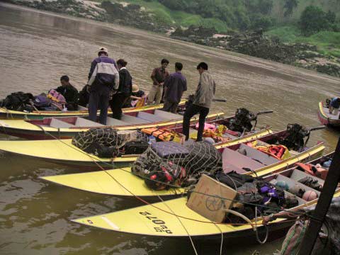 I couldn’t help but notice that as each boatful of people left, all the Laotians equipped themselves with motorcycle helmets and waterproof clothes. They obviously knew something we didn't. When it was finally our turn, I worriedly watched as my backpack was tied in place with some feeble-looking ropes among the others to the bow of the long, skinny boat; it assumed a dangerous outward-facing position, which I knew would make it the shield for everyone else's bags from the splashing water. I'd already learned that here there was no use complaining in such situations, no “the customer is always right” attitude, and guardedly clutched my passport and camera in their plastic Ziploc fortress.